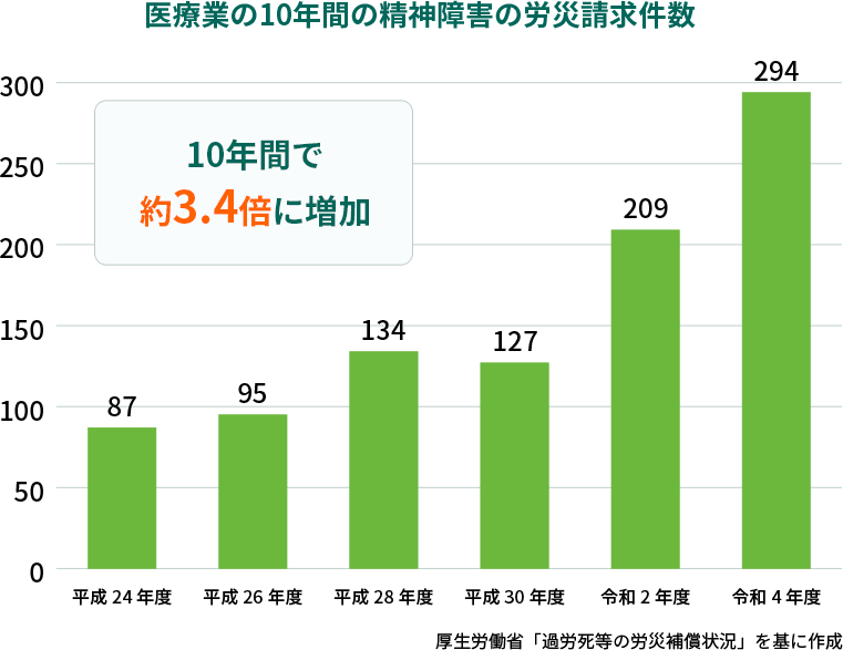 医療業従事者の「精神障害」の労災認定が増加しています。過労死等認定を受けた医師の脳・心臓疾患、精神障害・自殺の件数